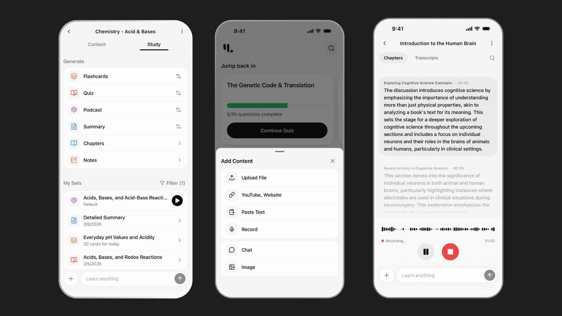 Turn videos, PDFs, and notes into summaries, interactive chats, and quizzes you can use on the go.